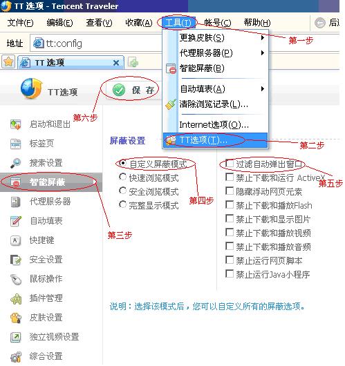 3. 在“TT选项”左侧菜单中,点击“智能屏蔽”。