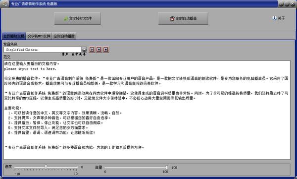 专业广告语音制作系统是一款非常简单且实用的广告语音制作软件,通过这款软件,可帮助用户快速制作广告语音,实际上就是将文字内容转换为语音文件,并可进行朗读,代替人工朗读,通过内置的发音角色进行朗读,有效降低了人力成本,软件作也非常简单,只需输入范文,进行语音设置,如速度和音量等,一键即可进行朗读,除此之外,还提供了文字转MP3文件工具和定时自动播音软件下载地址,可直接在指定网址进行下载,使用起来非常方便。