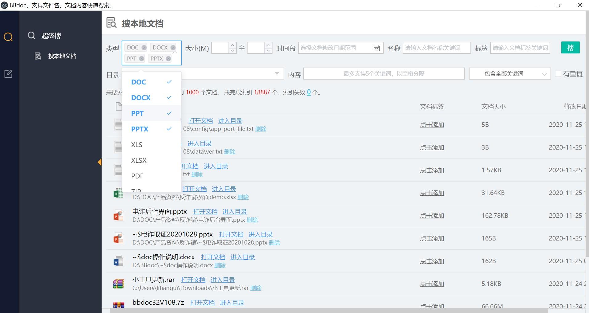 BBdoc电脑文档快速搜索工具支持WORD、Excel、PPT、PDF、TXT、CSV、压缩包等常用文档类型快速查找,支持多个文件类型查找,并支持与其它各条件组合搜索,各条件之间是同时满足的关系。