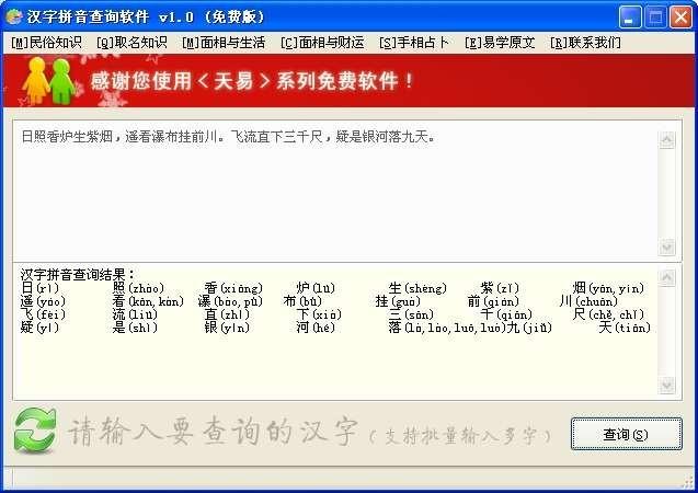 汉字拼音查询软件是一款汉字拼音快速查询软件,软件使用非常简单,直接输入汉字或复制汉字到指定的文本框,即可得到相应的拼音以及拼音标注。
