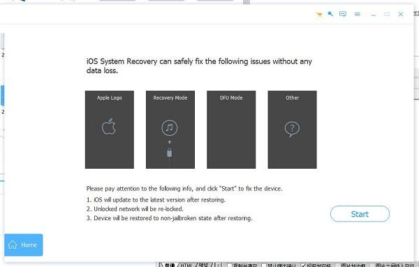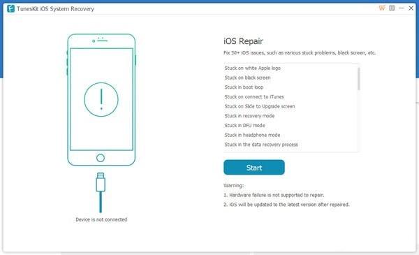 6、这里就是软件修复的界面,将你的iOS连接到这里,点击start
