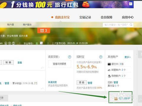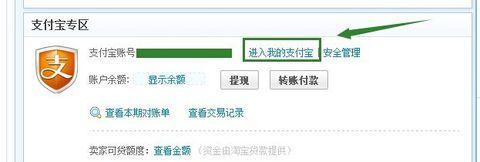进入卖家中心页面后,移动鼠标拉到网页至中间的位置“支付宝专区”,点击边上的“进入我的支付宝”,如下图。