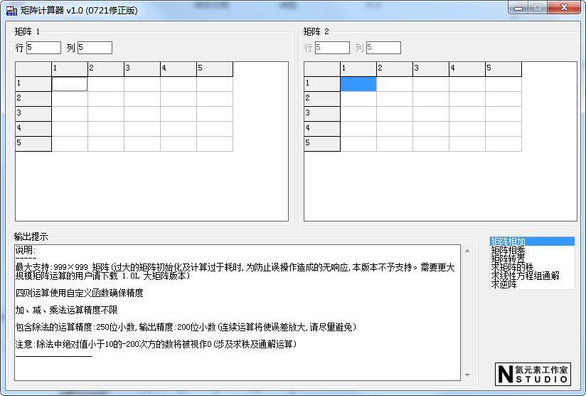 本矩阵计算器对矩阵大小进行限制,仅支持最大999×999的矩阵。该限制是由于在测试中发现,若改变矩阵大小,矩阵在初始化及运算时都将比较耗时。为了防止误输入造成的长时间等待。(1.0L版无此限制,若有大矩阵运算要求且对运算时间不敏感请使用1.0L版)