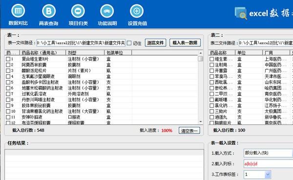 举例: 表一中有表头“药品项目”,其中内容为:“创可贴”,“碘伏”,“山楂丸”。表二中有表头“药品名称”,其中内容为:“碘伏”,“创可贴”,“棉签”。本功能可以筛选出两表中的不同之处,并生产报告表单。如:“山楂丸:表一有表二没有”,“棉签:表二有表一没有”