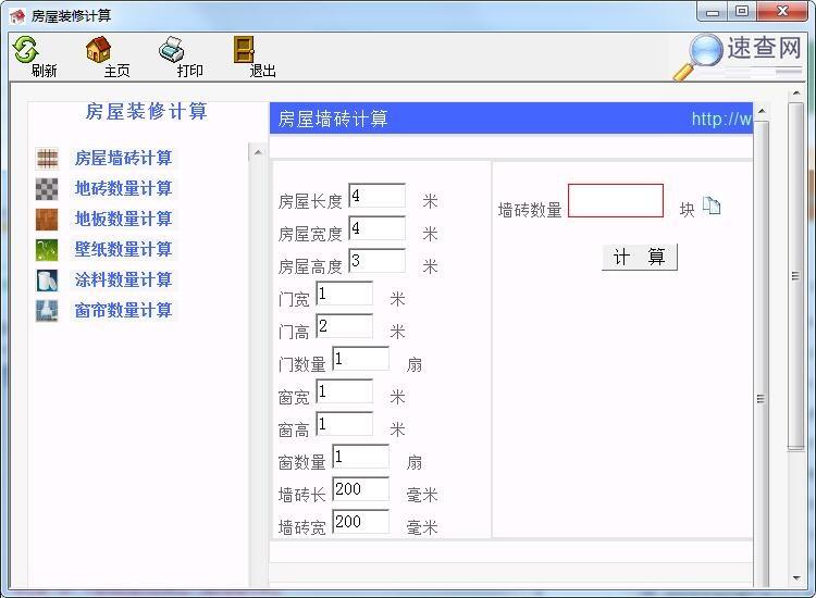 用于房屋装修材料计算,包括:房屋墙砖计算、地砖数量计算、地板数量计算、壁纸数量计算、涂料数量计算、窗帘数量计算。
