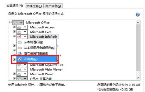 4、在安装选项中,选择自己需要的功能安装,不需要的功能,在单击该功能会弹出下拉菜单可以选中不可用,文件位置,默认,C盘