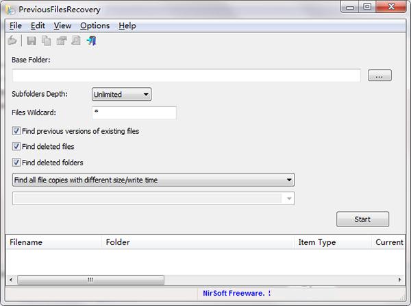 运行PreviousFilesRecovery之后,您应该选择要扫描的基本文件夹,在该文件夹下要扫描的最大子文件夹数(子文件夹深度),要扫描的通配符(默认为所有文件-*)以及要查找的文件类型(上一个) 文件,已删除文件和已删除文件夹的版本)