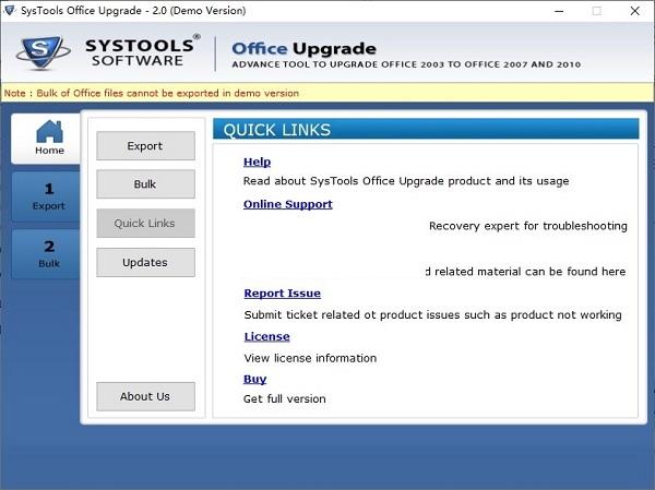 SysTools Office Upgrade版是一款简单实用的office文件升级软件。旨在帮助您将ppt、doc、xls等office文件升级到新版的pptx、docx、xlsx格式,以更好的进行打开与使用,而且采用了简单的向导式界面,即使是新手也能轻松完成转换。