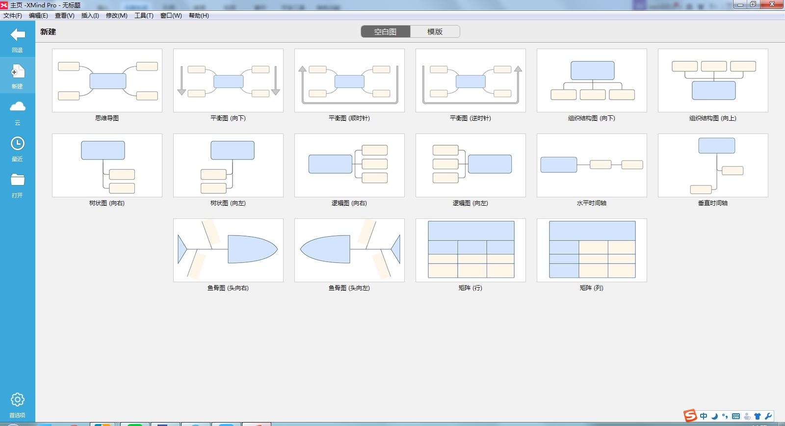 1、进入XMind,首先看到的是新建模板界面,这里可以挑选从某个模版开始,或者某种风格的空白图开始。