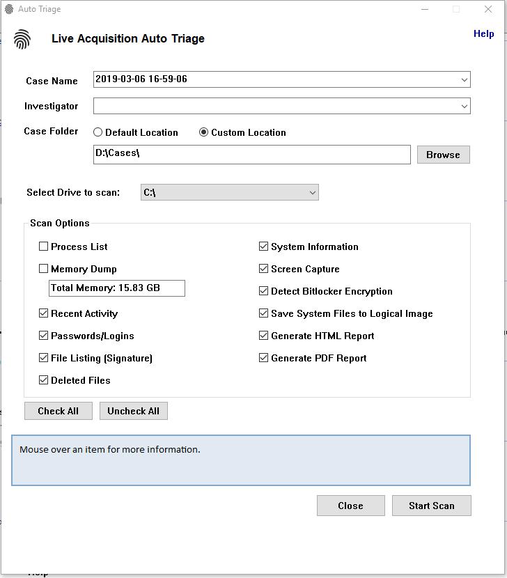 确认案例文件夹位置、驱动器和扫描选项正确后,只需单击“开始扫描”按钮即可启动自动分类扫描。