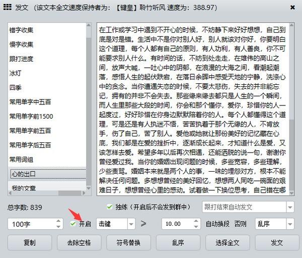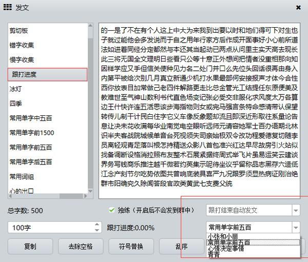 下方的为线上文本,跟打线上文本可以参与排行榜排行哦。文本选择好后,您可以点击选择全文,或者在左下方输入每一段要跟打的字数,即可点击发文。如果您不想顺序跟打,按下CTRL+L可以乱序文本。(快捷键设置中可以设置)