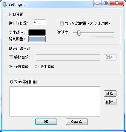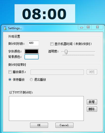 在悬浮窗上点右键,设置,可以调整倒计时时间(秒)、透明度、显示机器时间、颜色、倒计时播放音乐、不计时PPT。