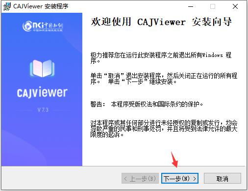 1、在本站下载caj全文浏览器最新版软件包,解压缩后双击“CAJViewer 7.3.141.self.exe”程序进入欢迎安装界面,点击“下一步”继续