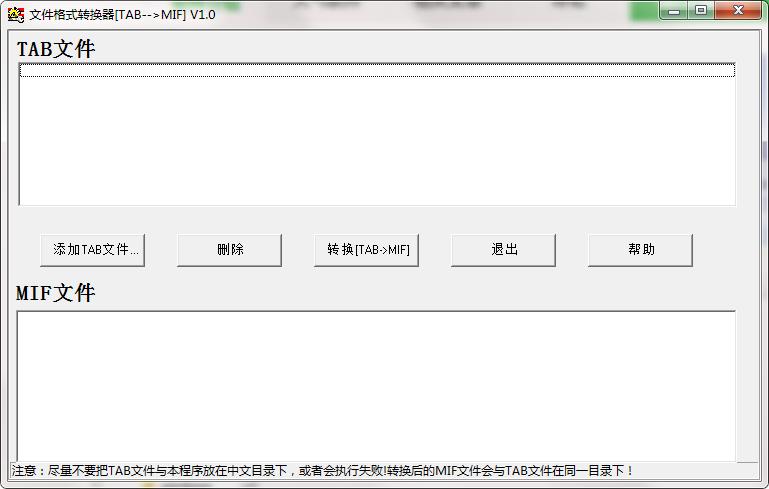 tab转mif文件格式转换器版是一款专业的可以帮助用户将tab转换为mif文件格式的工具。用户使用tab转mif文件格式转换器最新版时解压后要把这个程序与要转换的文件放在同一个目录,同时记目录名中不能包含中文字符。tab转mif文件格式转换器版界面简洁,作简便,易于上手。
