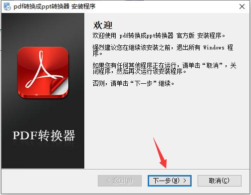 1、在本站下载pdf转换成ppt转换器软件包,解压缩后双击“pdf2ppt.exe”程序进入欢迎安装界面,点击“下一步”继续