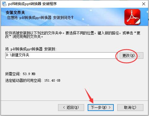2、软件默认安装位置为“C:/Pgram Files (x86)/pdf转换成ppt转换器”,点击“更改”可以自主选择其它位置安装,点击“下一步”即可开始安装