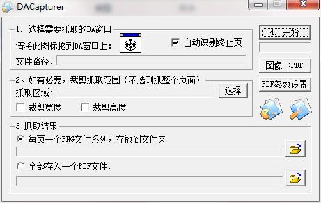 DACapturer最新版是一款相当专业实用的PDF转换软件。DACapturer最新版软件还可以将图像文件(PNG、GIF、JPG、BMP、TIFF)批量合并、转换成PDF文件。DACapturer电脑版可以抓取用DesktopAuthor(以下或称DA)制作的电子书的页面,转换成PNG图像或pdf文件。软件界面简洁,作简便,用户可以放心使用。