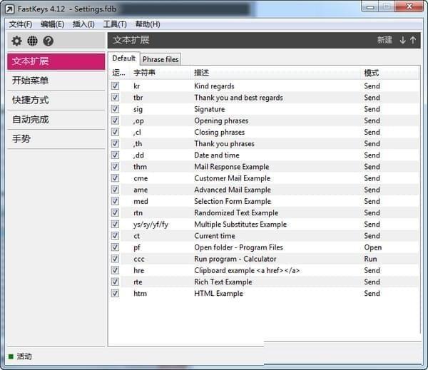 FastKeys版是一款功能强大的键盘快捷自动化软件,FastKeys版能够自动化包括文件扩展器、开始菜单、手势、和用户命令等,FastKeys版能够减少打字时间、输入选择字段,软件能够自动执行计算机上任何作。软件能够记录击键和鼠标作,从而来教导计算机自动执行任务。软件能更正键入时输入的错误。