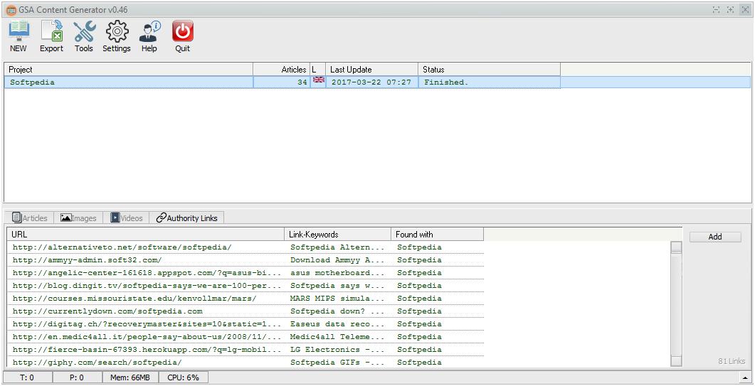 GSA Content Generator版在主窗口的上半部分为您提供有关项目的相关,而底部则为实际搜索结果保留,它们分为四个不言自明的类别,即文章,图像,和权限链接。