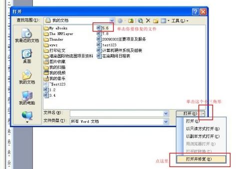 首先打开word(找一个任意没有损坏的word文档打开),单击文本恢复转换器“工具”→“选项”→在“常规”选项卡,找到“打开时确认转换”并选中,点击“确定”退出,再点击word软件的“文件”-“打开”-找到你需要修复的文件-单击选中(请不要双击直接打开),在“打开”按钮的右下角的多出了个小黑色三角型,发现了没有?在下图中红点的位置。点击它,选则“打开并修复”选项,即可修复您损坏的word文件!