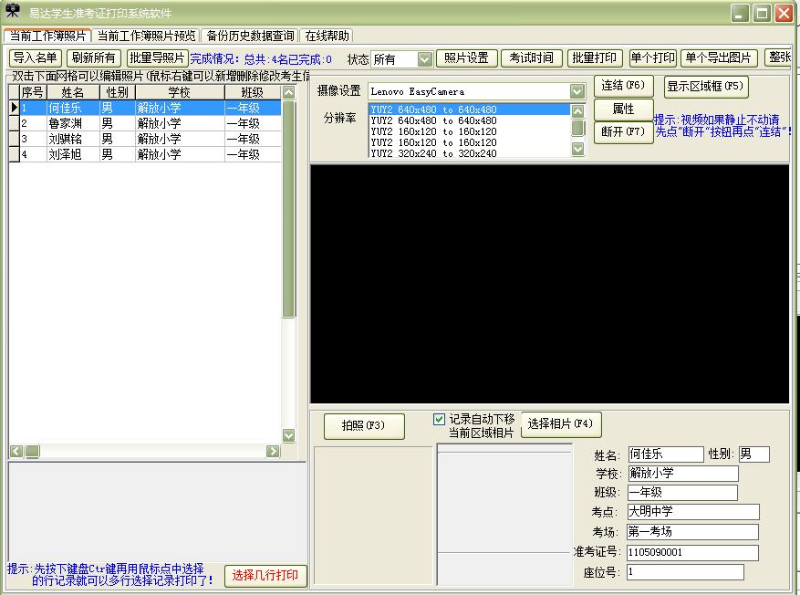 易达学生准考证打印系统软件作说明能快速采集学生照片,单个和批量打印学生准考证,是学校一款非常实用的工具。系统采集支持摄像头、摄像机。采集照片速度极快,照片大小可选一寸、二寸,自定义大小。也可以从现有照片中选择和剪切照片,证件照设计简单明了,有模板和自定义设计。支持即拍照即打印功能,可自己设置好打印模板,实现随拍照随打印的功能。支持普通打印和套打打印功能,支持背景打印功能支持A4纸准考证打印功能,即拍照即打印能有效杜绝顶考功能,准考证上的照片和本人一一对应。