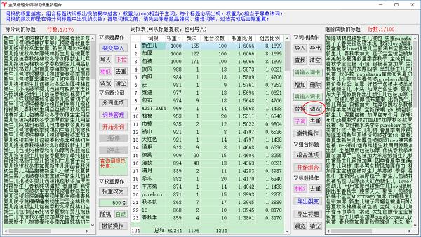 4、权重设置:可固定值、随机或者自动,还可撤销,权重区分主副词和屏蔽词(权重1000为主词,1~999副词,0屏蔽词),有利用优化标题;合理的分配权重,有利于组合出来的新标题拥有更多的搜索展现量;