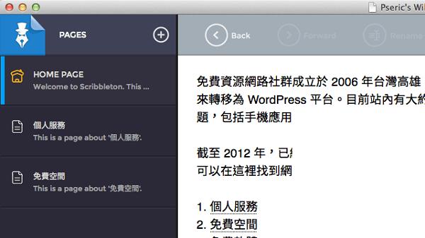 Scbbleton版是一款带有wiki功能的个人笔记软件。你不需要有太多的技术就可以快速建立个人的wiki,并且你还可以随时打开软件记录,使用软件的智能整理功能,迅速的把文件整理起来。