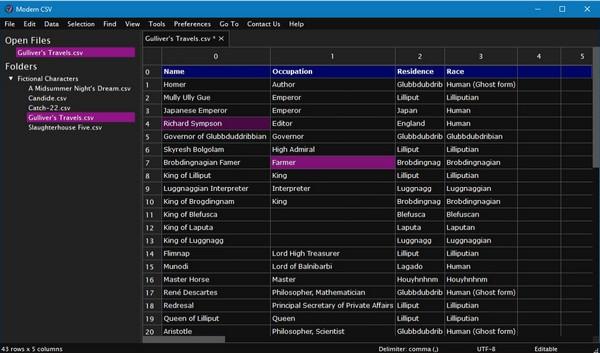 Modern CSV最新版是一款功能齐全的CSV文件编辑器,Modern CSV最新版可以帮助用户快速地处理CSV文件,Modern CSV最新版支持多单元编辑的功能,软件还支持大文件处理和支持查找数据的功能,软件加载文件的速度比Excel快11倍。软件能够按升序或降序对行或列进行排序。