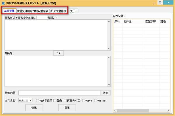 文件字符替换功能,可以批量替换一个目录下的所有文本类型数据。简单实用。可以查账替换文本任意指定的代码,用于网站被马后的页面批量替换、电子书批量加广告文本等;