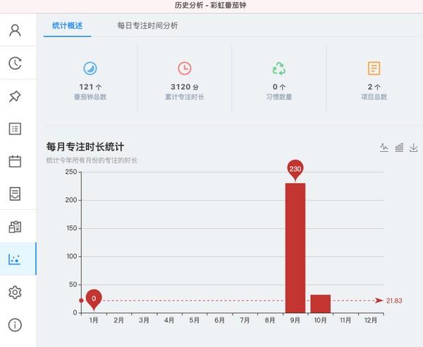 4、在历史分析功能当中提供统计概述,可以查看每月的专注时长和变化