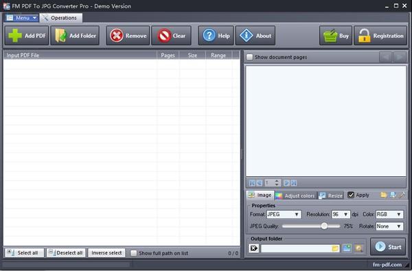 FM PDF To JPG Converter P这个专业的软件可以批量模式将PDF文件转换为BMP、GIF、JPG/JPEG、JPEG-2000 PNG、TIFF和TGA输出格式的图像。它包含一个有用的内置 PDF 查看器子系统。在转换过程中,应用程序可以显示当前的 PDF 页面。