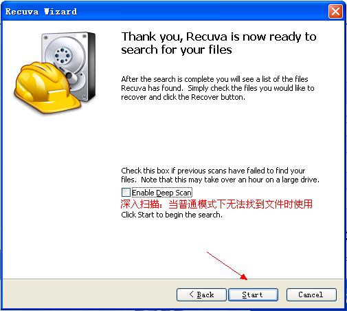 这里有一个“深入扫描”的复选框,当我们使用普通的扫描模式无法找到我们删除的文件时,可以尝试使用深入扫描模式