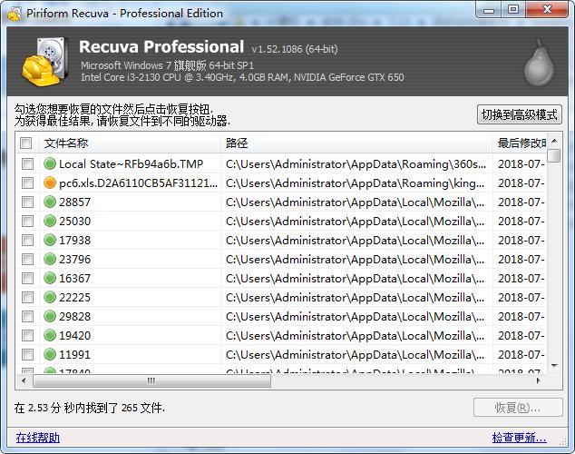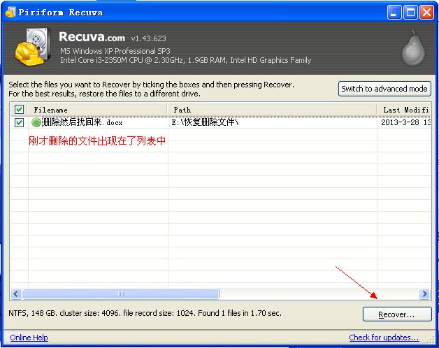 工具找到系统中指定位置可以恢复的文件列表,选中对应文件,点击【Recover】
