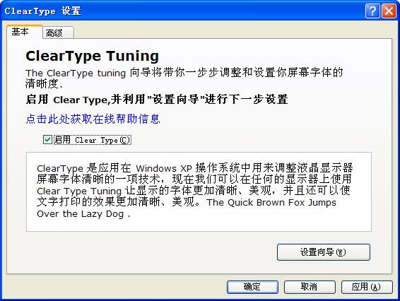 是一种 Windows 用来优化液晶显示器文字显示效果的技术,使用 ClearType 可以让文字显示得平滑而美观。ClearType Tuning 就是调整这种效果的工具,使用它可以根据你的显示器将 ClearType 调整至最佳效果。