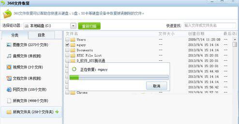 4、接下来,我们尝试使用360文件恢复器恢复功能恢复名为my的文件夹,这时候我们可以看到该文件夹的“可恢复”为空白,如果大家要确定该文件夹里面的文件恢复是否高时,可以切换到“目录”路径查看,尽量选择可恢复较高的文件进行恢复,最后点击“恢复选中的文件”进行最后的恢复作。
