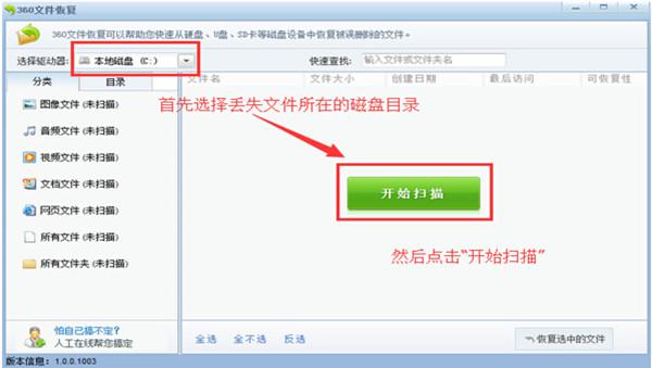 1、下载360数据恢复后,打开360文件恢复器,选择需要恢复文件所在的磁盘;如果需要恢复U盘等移动设备的先将U盘连接到电脑上,等待电脑显示“可移动设备”的图标显示即可。接下来点击“开始扫描”,等待磁盘扫描结束。
