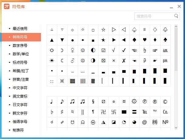 3、进入万能五笔输入法符号库后,我们选择左侧功能栏第二行中的【特殊符号】,选择你需要的符号单击即可输入。