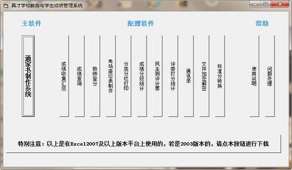 具才学生书软件系统最新版是专业比较高的制作工具,具才学生书软件系统最新版可以帮助使用者根据提供的成绩数据自动添加、编辑,节省用户的制作时间,根据班主任工作实际需要而制作。具才学生书软件系统版基于EXSEL制作,一键导入学生和成绩,快速点评学生,并且该软件会自动生成家书,快速打印,省去非常多的麻烦。