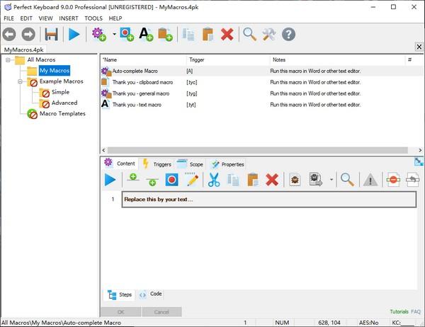 Pitnec Perfect Keyboard P版是一个宏程序,主要针对那些需要使用键盘自动插入文本和数据的用户。完美的键盘包含宏工具功能的子集。它允许用户创建运行在所有Windows应用程序和web站点中的宏,并通过键盘快捷键、热键和任何应用程序中的自动完成功能来启动它们。宏记录器(键盘记录器和鼠标记录器)和宏编辑器使创建新的宏变得很容易。宏可以由按键(击键)、鼠标点击和宏命令(内置了300多个命令)组成。完美的键盘为用户带来更快、无错误的打字,完成Windows的自动化和可的处理各种重复任务。