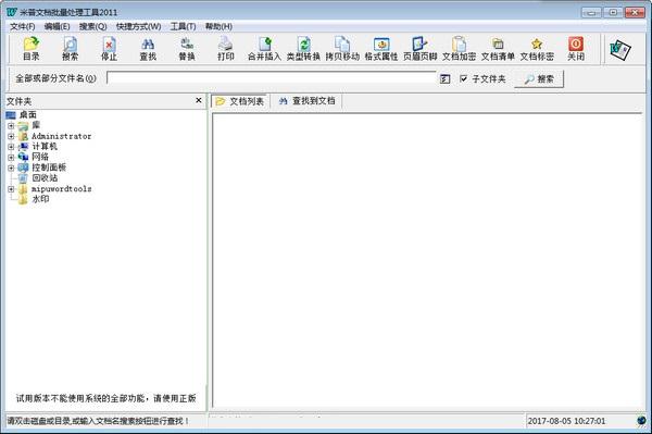 米普word文档批量处理工具版是一款非常优秀的wod文档批量处理软件,米普word文档批量处理工具最新版支持查找、替换、打印、合并、拷贝、类型转换、格式、页眉页脚、加密、标密等一系列的作,米普word文档批量处理工具版包括了批量的处理模式,也可进行文档的查找,需要进行关键词的输入。