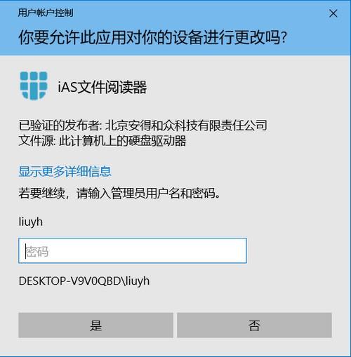 9.关于安得卫士和云盒阅读器安装使用过程中权限的问题 阅读器在使用过程中,需要对文件进行保护,所以需要对文件的读取程序进行控制,这必然会使用到系统管理员角色,所以当 用户使用过程中,当前登录的系统账户是非系统管理员角色,会导致无法使用,请切换当前用户到管理员账户,或者给当前账户分配管理员角色权限。 如下图所示,win10系统打开云盒阅读器时,会弹出如下窗口: