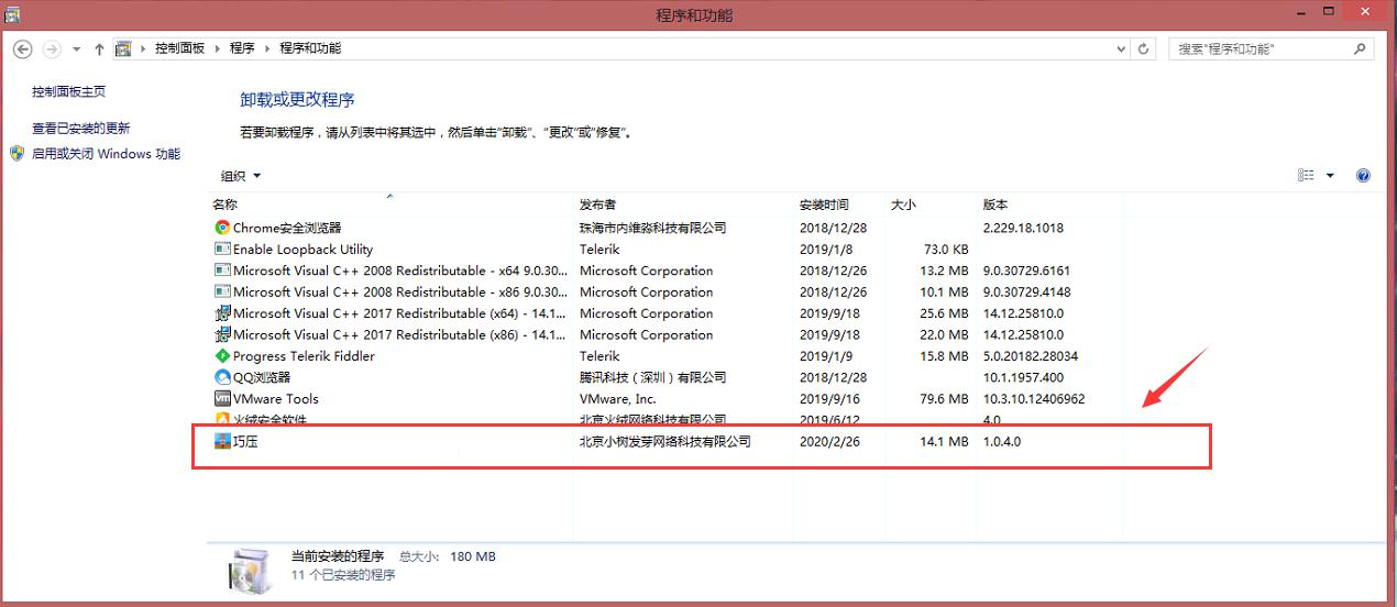 第三步,点击“卸载程序”,弹出卸载或更改程序页面,在页面上找到“巧压”软件,