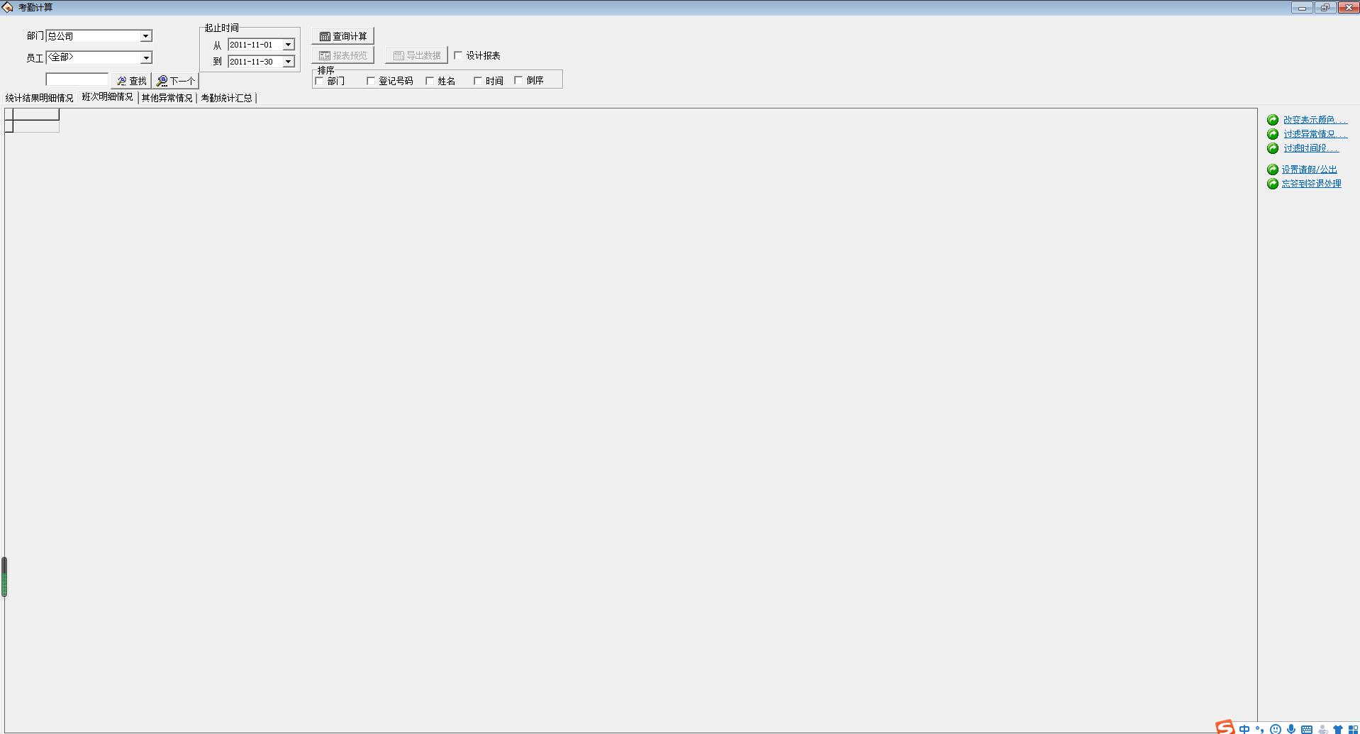 答:首先到班次管理中察看设定班次的情况,正确的情况下和班次名称对应右边时间框中有蓝色时间段显示,如果没有问题,到员工排班中,查看给员工所排班次的启用期,是不是在统计时间范围之前,如果不是重新排班,确定新的启用期。
