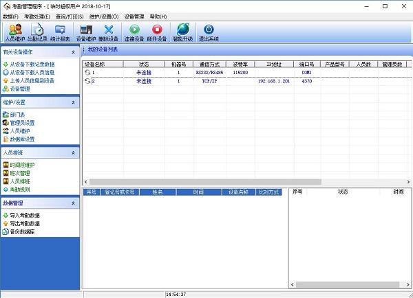 1、将在设备上登记好的用户的指纹或卡下载到软件中(连接设备-从设备下载人员数据)