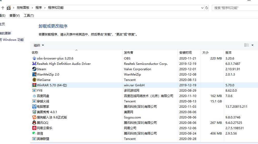 2、点击“卸载”,进入到程序的卸载和更改界面,在界面上可以看到我们电脑安装的所有程序。