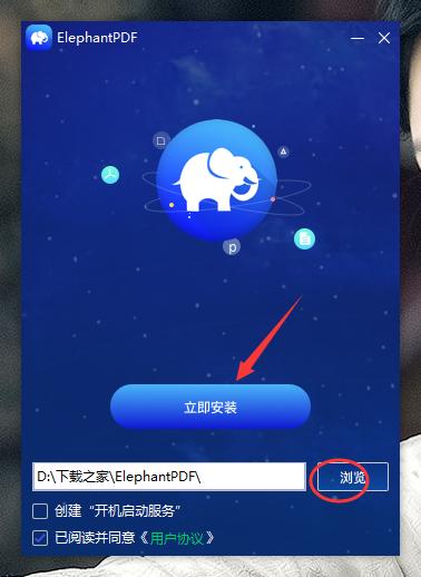 3、软件默认安装位置为“C:/Pgram Files (x86)/ElephantPDF/”,小编建议用户点击“浏览”选择C盘以外的磁盘安装,选择好安装位置后点击“立即安装”即可