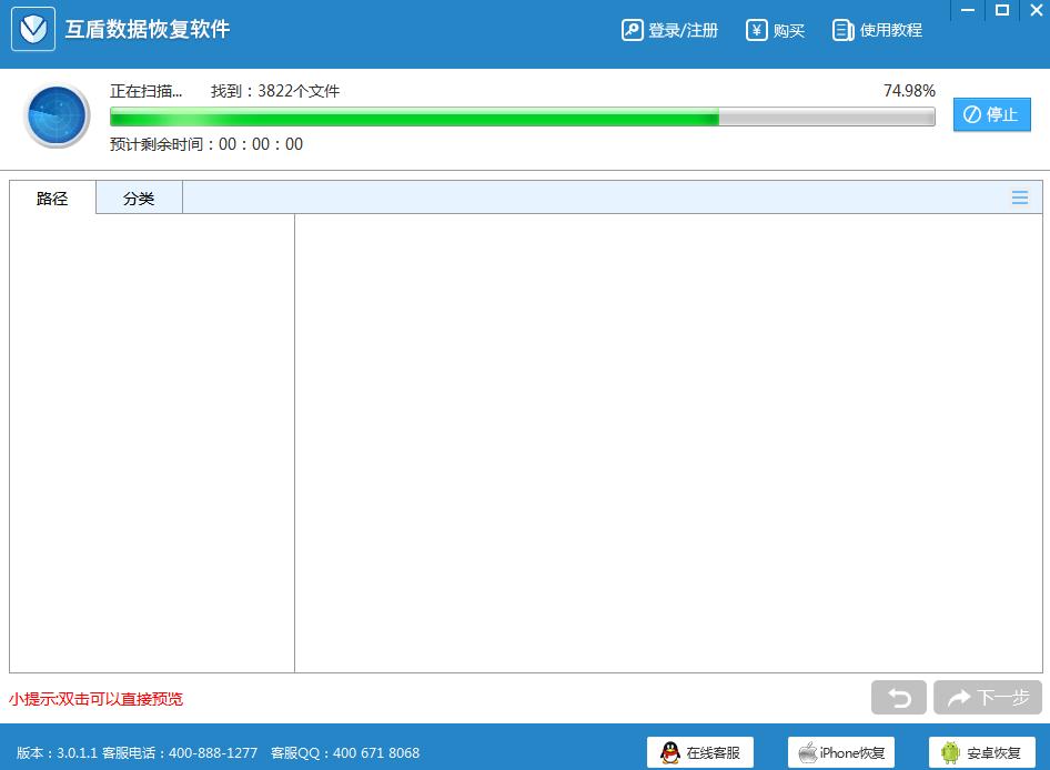 答:软件扫描时间的长短,一般是根据用户所扫描的文件大小决定。扫描1G大概需要5分钟的时间,请用户耐心等待。