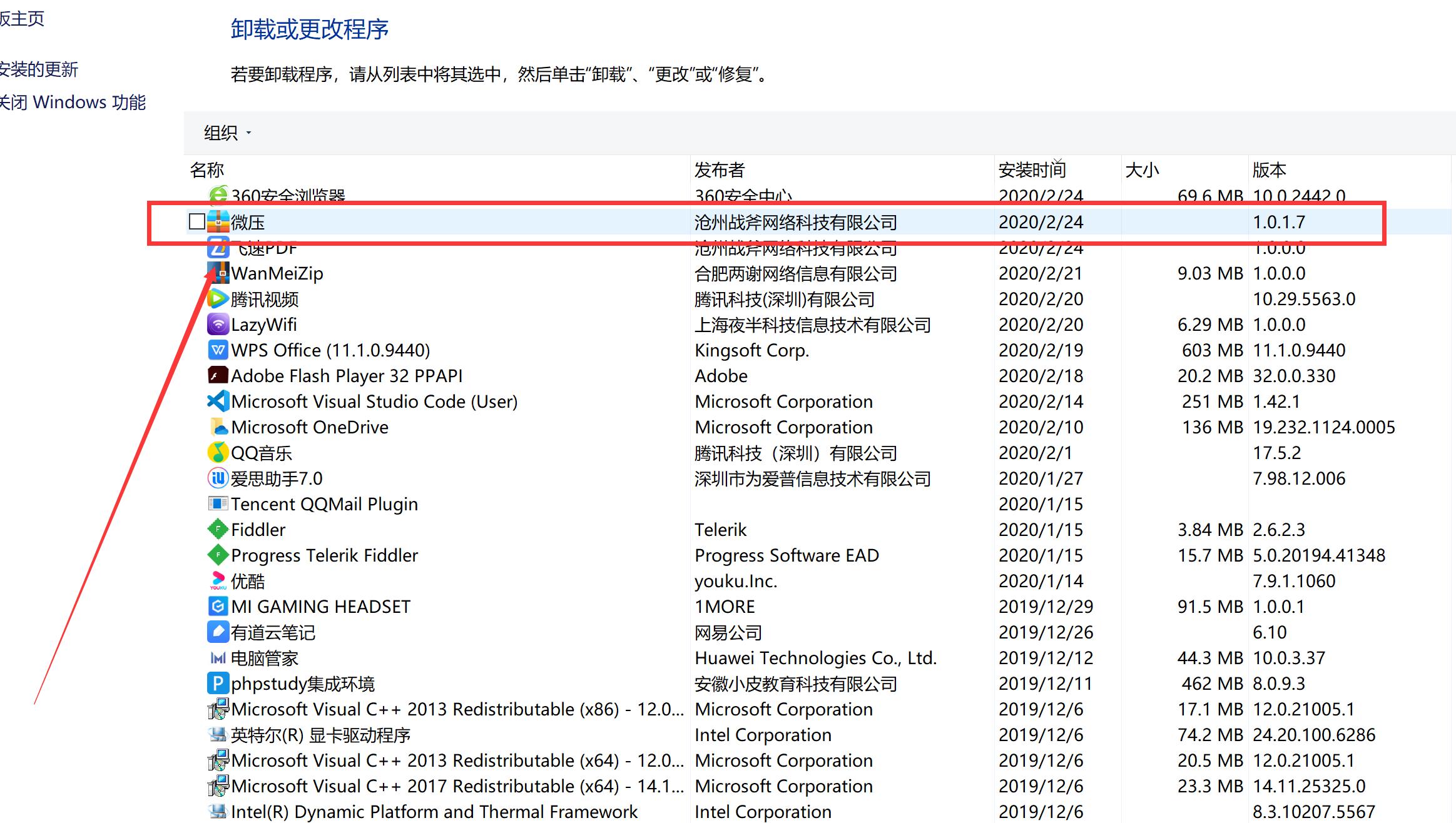 第三步,点击“卸载程序”,弹出卸载或更改程序页面,在页面上找到“微压”软件,