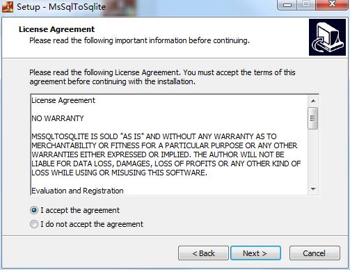3、阅读MysqlToSqlite许可协议,勾选“I accept the agreement”