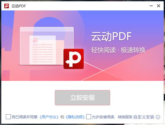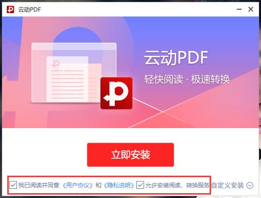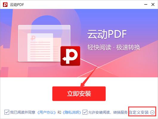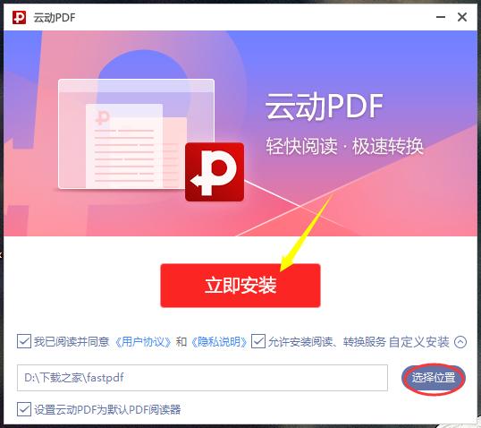 4、我们进入自定义安装设置,软件默认安装位置为“C:/Pgram Files (x86)/fastpdf”,点击“选择位置”可以自定义安装位置,这里小编建议勾选“设置云动PDF为默认PDF阅读器”点击“立即安装”